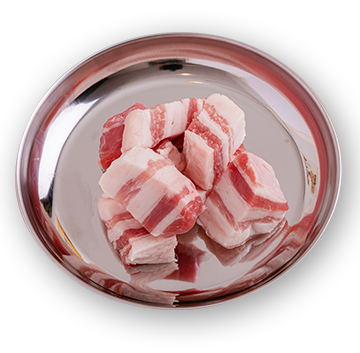 宮崎・霧島高原育ち、霧島山麓のSPFブランド豚(無菌豚)を使用したサムギョプサル。1.5㎝もの厚さにカットして、豚の美味しい味や食感をしっかりと感じられるようにしています。薬味をお好みでのせ、サンチュやエゴマで巻いてお召し上がりください。