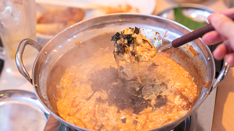 鍋の最後は余った出汁にご飯・卵・韓国海苔・チーズを加えて、特製炒め飯にするのが定番の楽しみ方です。ガツンとくる濃厚な旨味にやみつきになること間違いありません!